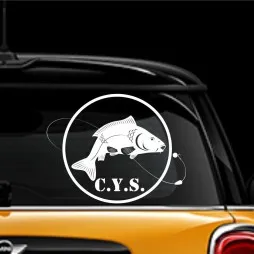 Pegatina para los amantes de la pesca con apoyo a la captura y suelta (C.Y.S.), podrás instalar este fantástico diseño una carpa en la luna trasera de tu coche o bien en la carrocería.